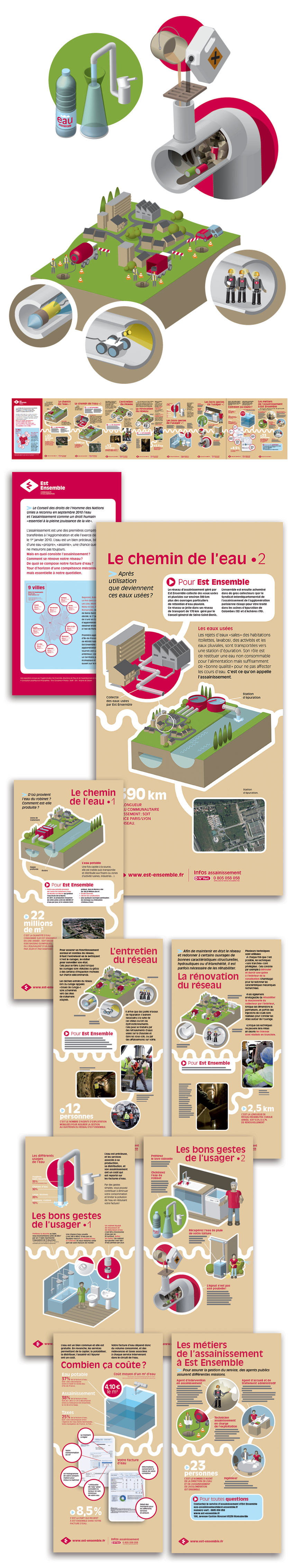Est Ensemble souhaitait réaliser une exposition pédagogique présentant le chemin de l’eau à travers le réseau d’assainissement dont la Communauté d’agglomération a la gestion. Outre la description des interventions de Est Ensemble sur le réseau, l’exposition devait délivrer des conseils pratiques domestiques à l’attention du grand public. Les neufs panneaux devaient être installés sur un stand à l’occasion de la manifestation “L’Ourcq en vert et bleu”. Ce travail a été réalisé en étroite collaboration avec Nicolas Londinsky du service Assainissement et Agnès Léopold de la Communication. J’avais donc le tâche de concevoir le principe visuel global et surtout, toutes les infographies didactiques.
