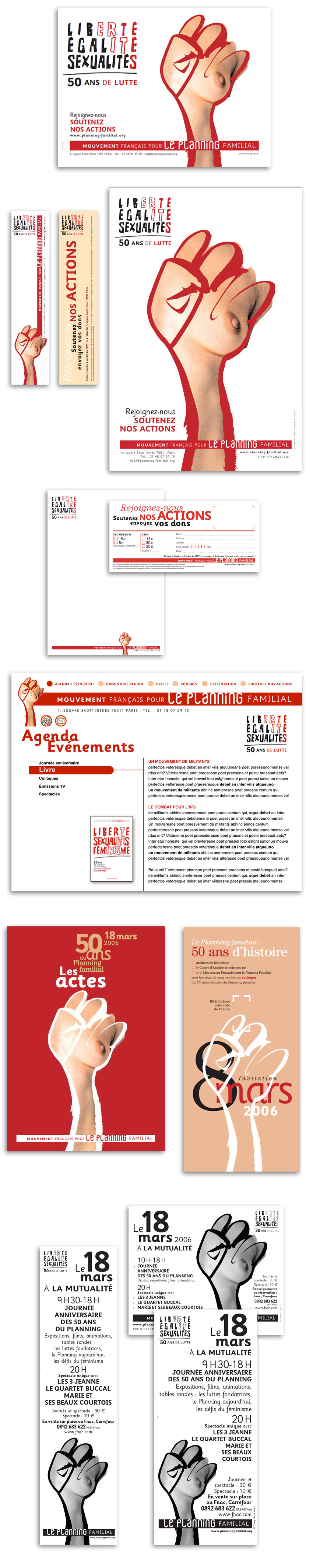 Suite à un concours ciblé, le Mouvement Français pour le Planning Familial m’a confié la conception graphique de la campagne des 50 ans dont le mot d’ordre était “Liberté, égalité, sexualités, 50 ans de lutte”. Cette campagne nationale diffusée sur une large palette de supports devait incarner l’histoire d’un mouvement féministe engagé pour la défense des femmes et de leurs droits.