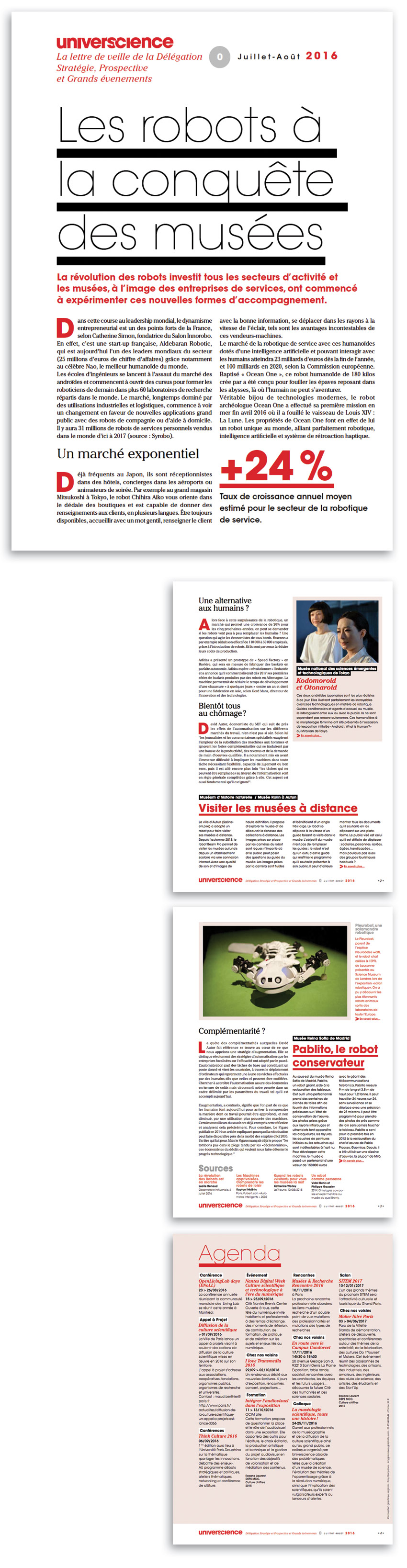 La lettre de veille est un outil de communication interne de la Délégation Stratégie, prospective et grands événements à Universcience. Elle permet de diffuser par thématique les informations relatives aux évolutions des musées dans le monde. Le document est réalisé en interne chaque mois, et Géraldine Delaforge et Olivier Richard m’en ont confié la conception.