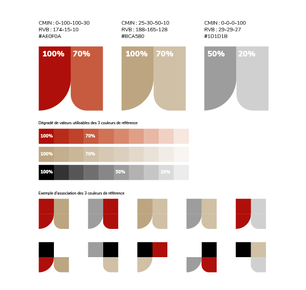 La charte graphique se développera avec les modules auxquels seront ajoutées les couleurs rouge profond, gris, et beige. Ces teintes sont tirées de l’environnement visuel de l’activité de l’entreprise : rideaux rouges, structures métalliques, planchers bois…