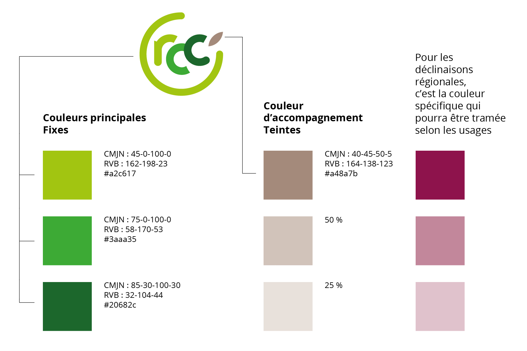 La conception du logotype national devait se décliner dans toutes les régions. Après proposition de divers fonctionnements graphiques et en collaboration avec Stéphanie Vincent-Sweet, chargée de communication au RCC, il a été décidé de choisir une couleur d’accompagnement pour charte réseau régional. J’ai alors proposé les couleurs en fonction de perceptions personnelles et constitué une gamme de 13 couleurs. L’exercice s’avérait périlleux, mais finalement, il n’a pas fait l’objet de revendications ou exigences particulièrement difficiles.