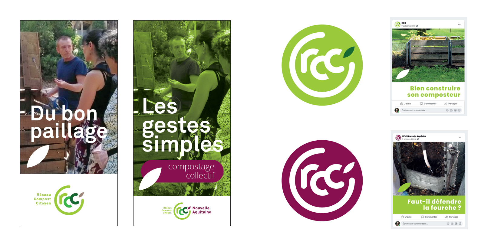 Suite à une consultation défrayée entre trois prestataires, au regard de mes propositions, le Réseau compost citoyen m’a confié la réalisation de leur nouvelle identité visuelle. Le RCC est une association nationale de promotion de la prévention et gestion de proximité des biodéchets et du compost citoyen. Il devait moderniser son image, afficher une marque, pour s’affirmer comme une alternative sérieuse et nécessaire pour la gestion de proximité des biodéchets face aux grands industriels privés, à l’attention des institutions et des citoyens. Étant particulièrement sensible à la question du traitement des déchets, j’ai accepté de participer à cette consultation retreinte avec engagement pour être avant tout force de propositions.