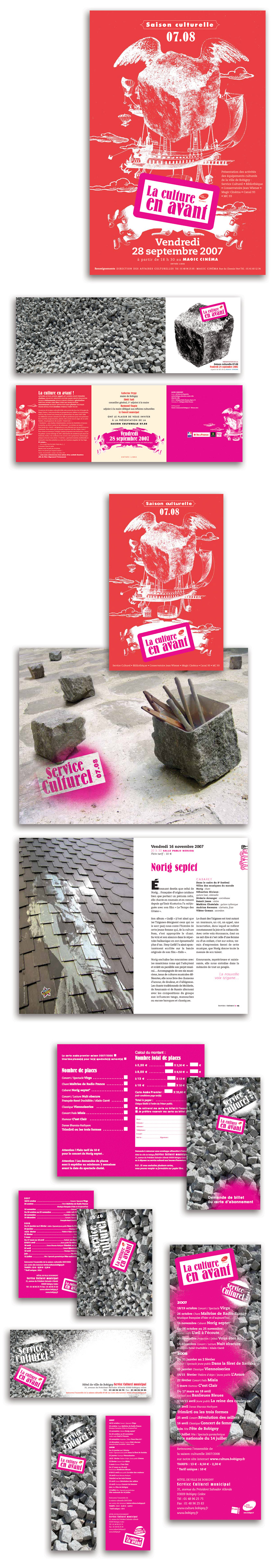 Les visuels des spectacles seront intégrés aux murs de la ville, les pages d’ouverture seront des interprétations ludiques de pavés et murs pour servir les thématiques, et une montagne de pavés illustrera les documents du service culturel. Pour ce type de travail, très complet, il est nécessaire de vivre en permanence avec le sujet, de pouvoir capter tout ce que l’on voit autour de nous, au concept omniprésent à l’esprit. Lorsqu’en vacances au Portugal, je tombe sur la montagne de pavé de la rénovation de la place de la mairie, je prends les photos et de retour je propose Manuel Teixeira du service Culturel de bouleverser l’identité visuelle choisie.