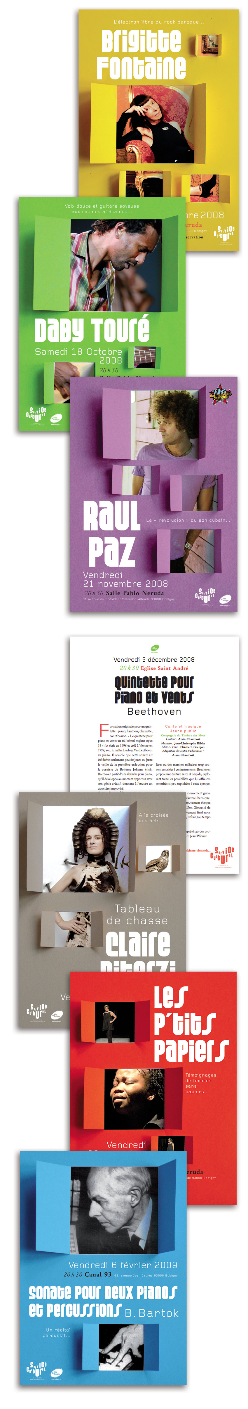 La ville de Bobigny me propose pour la troisième fois consécutive, la création graphique de la saison culturelle. Sur la même base que les années précédentes : campagne de lancement de saison, programme, affiches, flyers, et identité visuelle annuelle du service Culturel de la ville. Pour la saison 2008-2009, Muriel Blachère, chef du service Communication, me demande de travailler sur la curiosité.
