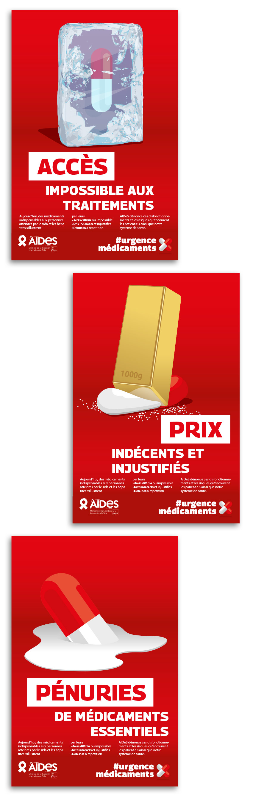 Dans le cadre de l’agence CUP, nous répondons à un concours non rémunéré ouvert à trois agences, pour une campagne de plaidoyé pour AIDeS. Elle a pour but de sensibiliser les décideurs politiques à agir auprès des laboratoires et de s’engager au service de l’intérêt général et des publics fragilisés, dans la défense de l’accès aux médicaments. Elle se déploie sur enjeux, trois axes : l’accès, le prix et les pénuries.