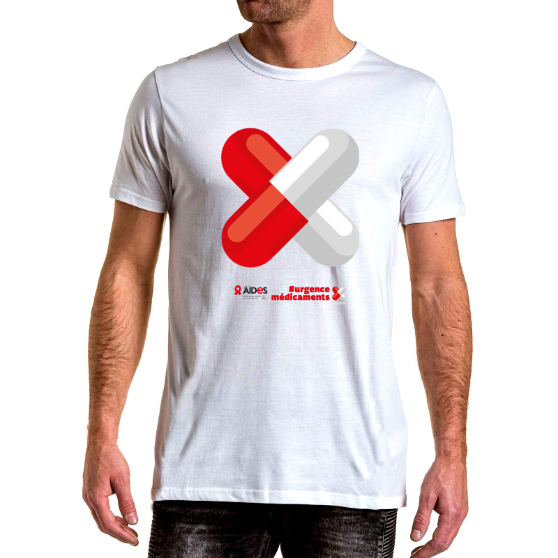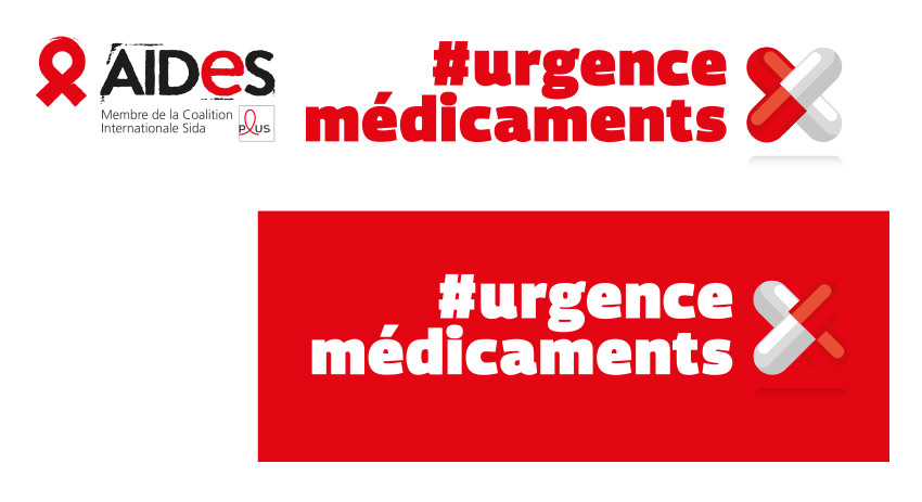 Le visuel générique de campagne est composé du hashtag « #Urgence médicaments » (proposé par Nathalie Marx), et d’une croix indiquant un stop, mais figurant aussi une flèche invitant à avancer.
